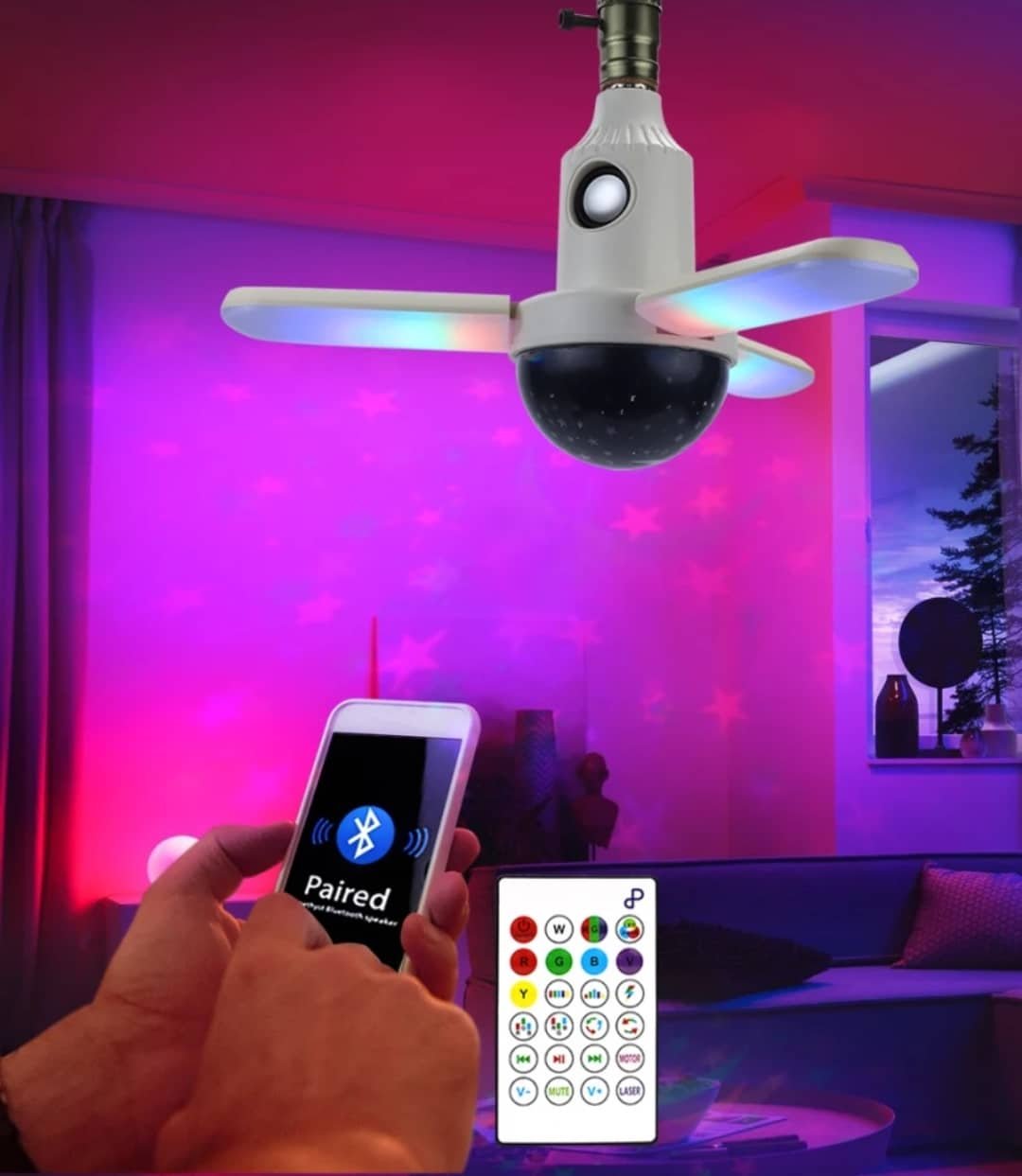 Erős fényű LED-es RGB+CW színes fényforrás, bluetooth kapcsolattal, 5W-os hangszóróval. Telefonról és távirányítóval is vezérelhető.