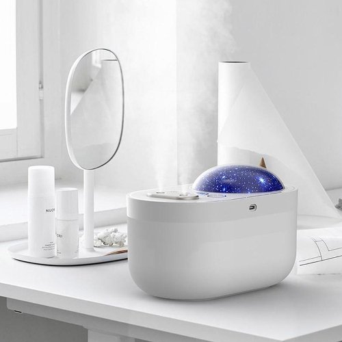 A szobák száraz levegőjének párásításhoz talán a legalkalmasabb eszköz a hidegen párásító diffúzor, de ez az elegáns készülék ennél is többet tud. Egy színes ledekkel működő projektort is rejt magában, így a kellemesen párás levegő mellett a hangulatos fények is hozzájárulnak kényelmünkhöz. A projektor elé kétféle képet választhatunk: hangulatunktól függően tengeri állatokat vagy bolygókat vetíthetünk a környezetünkbe.