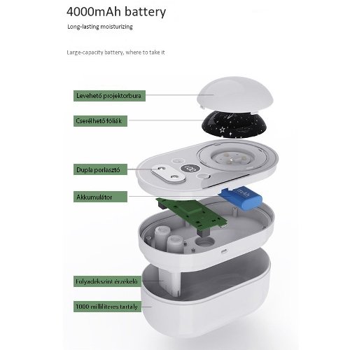 A készülék nagy, 1000 milliliteres tartályába tiszta, lágy vizet érdemes tölteni, használat után pedig belülről is megtisztítani. A projektort és a párologtató funkciót külön-külön is vezérelhetjük, utóbbi esetében folyamatos, illetve szakaszos párologtatás közül választhatunk. A készülék jelzi az akkumulátor töltöttségét, illetve alacsony folyadékszint esetén automatikusan kikapcsol.