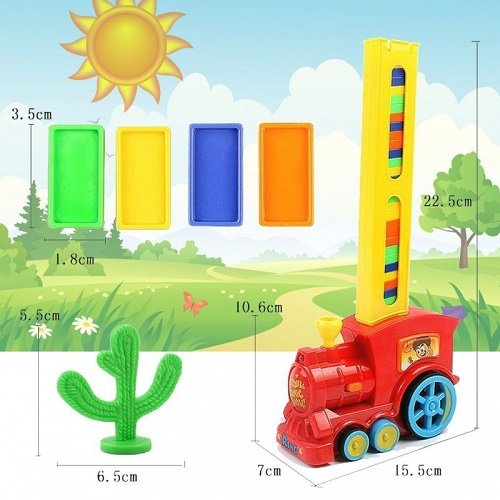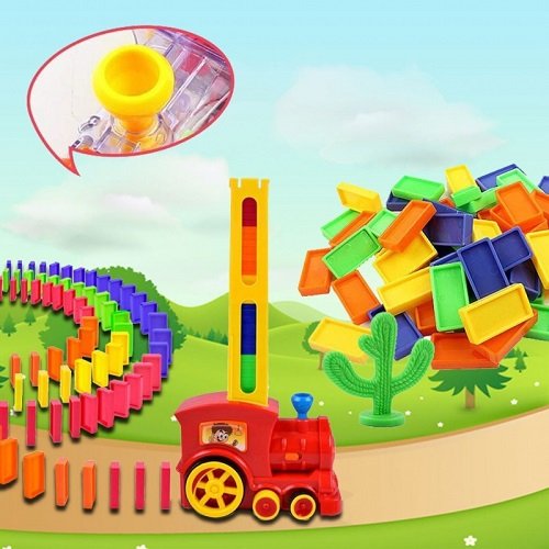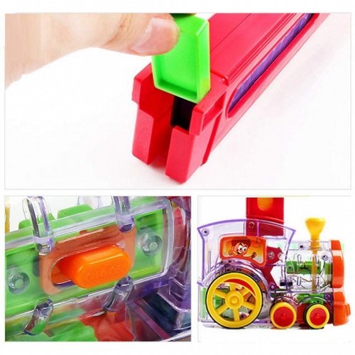 A színes vonat bekapcsolás után, valóban megy, világít, dudál és ami igazán egyedi – dominó utat épít!