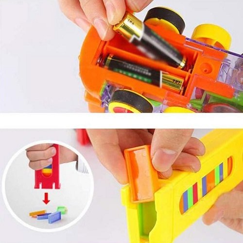 Először helyezze a dominókat a mellékelt tartóba, s miután a gombbal bekapcsolta, a vonat elindul és elkezdi szépen egymás után építeni a dominókat.