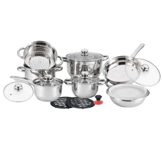 Akkor a minőségi rozsdamentes acélötvözetből készült, 11 rétegű szendvicstalpú edénykészletet ajánljuk. Ez az edénykészlet minőségi anyagból készült, amely ellenáll az oxidációnak és a karcolásoknak. A szett 7 különböző méretű edényt tartalmaz, így a készlet minden főzési feladatra megfelelő. Az edénykészlet tartalmaz 4 különböző méretű lábast, valamint egy 2,7 literes mély serpenyőt fedővel. Továbbá tartalmaz egy párlóedényt melyhez egy 20 cm-es vákumos tetőt. Az edények nem csak gáz és villanytűzhelyeken, hanem indukciós főzőlapokon is használhatók. Az edények nyelét fém fogantyúkkal és termofejes fém fedőkkel is ellátták, így a konyhában biztonságosan és egyszerűen használhatók. Továbbá, az edénykészlet tartalmaz 2 db bakelit alátétet, amely megakadályozza, hogy a forró edények a konyhapultot megégessék.