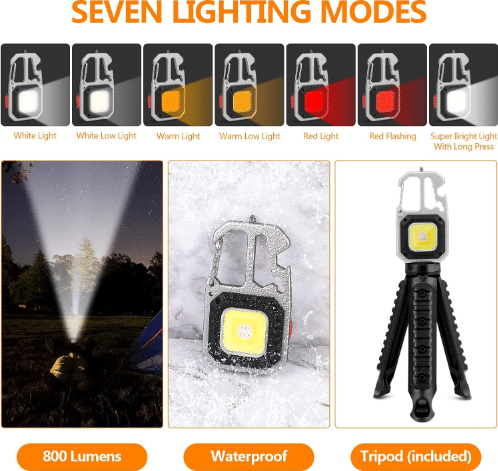 【Szuperfényes COB-fény】: Mini kulcstartós zseblámpánk 7 üzemmóddal rendelkezik, és akár 800 lumen fényt is képes kibocsátani széles szögű erős fény mellett. Igényeinek megfelelően különböző módokat választhat: fehér fény, halvány fehér fény, meleg fény, gyenge meleg fény, piros fény, piros vaku, hosszan megnyomva a nagyon erős fényhez.