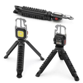 A zseblámpán található karabínerrel hordhatod öveden, táskádon vagy kulcscsomódon is, a mellékelt tripoddal pedig bárhova stabilan leállíthatod. A zseblámpa fényereje és világítási módja változtatható, de a világításon kívül használható sörnyitóként, csavarkulcsként, üvegtörő kalapácsként, ráadásul a hátoldalán találsz 4 különböző mini csavarhúzót is.