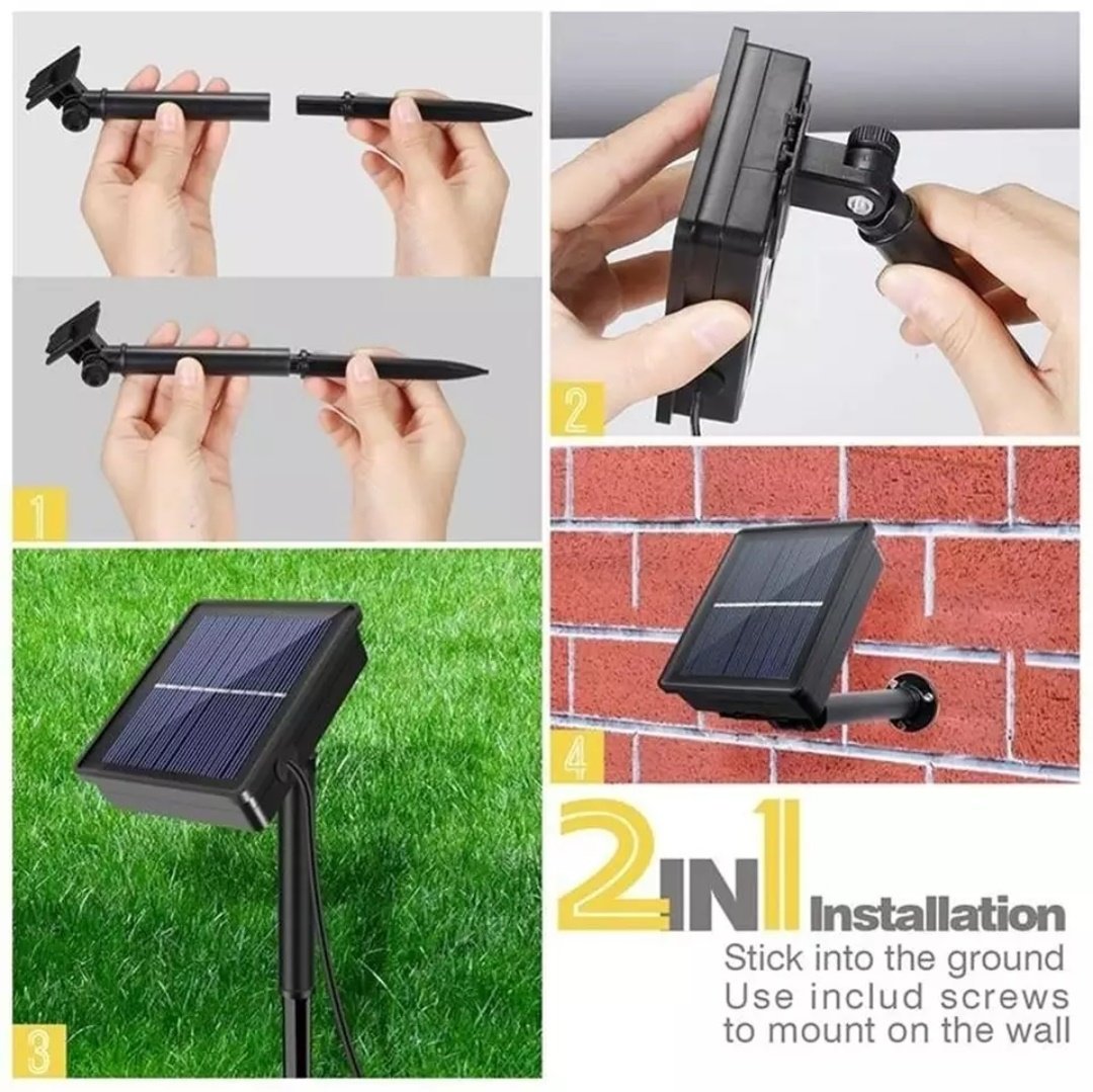 A napelem fölbe szúrható vagy a falra rögzíthető csavarokkal.