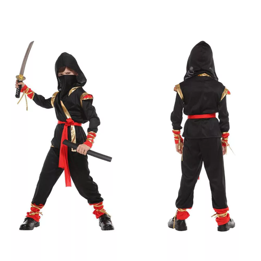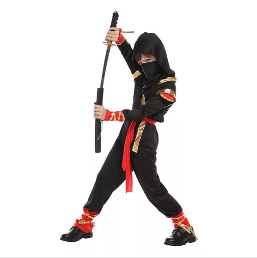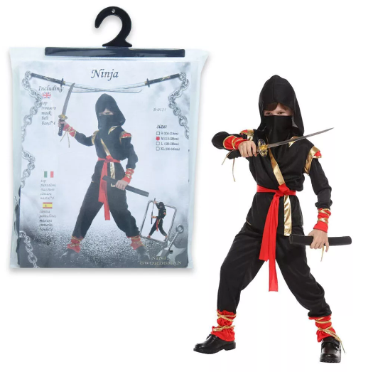 Gyermeked igazi nindzsa bőrébe bújhat a csomagban található fekete arckendő, nadrág, felső, piros öv és arany szalagok segítségével.