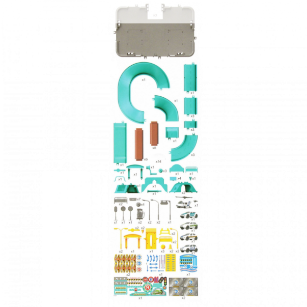 A készlet tartalma: parkoló, 4x autó, 1x helikopter, útkiegészítők.