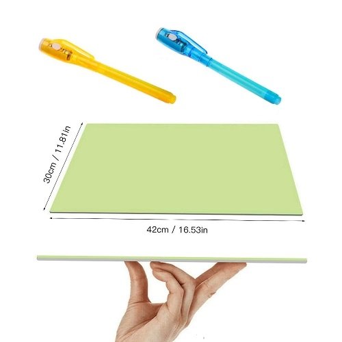 A foszforeszkáló rajztáblára két UV-fénnyel világító tollal tudtok rajzolni. A tábla magába szívja a fényt ott, ahol a toll elhaladt felette, és egy darabig azt beszívva foszforeszkál.