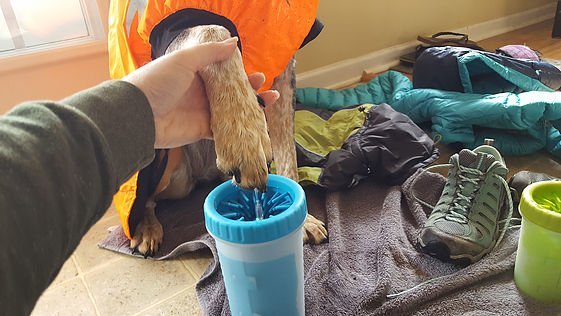 A tisztító tartályát töltsd meg vízzel, majd gyengéden helyezd be, majd húzd ki a kutyus lábát.