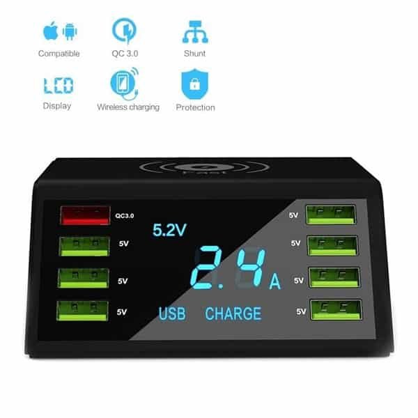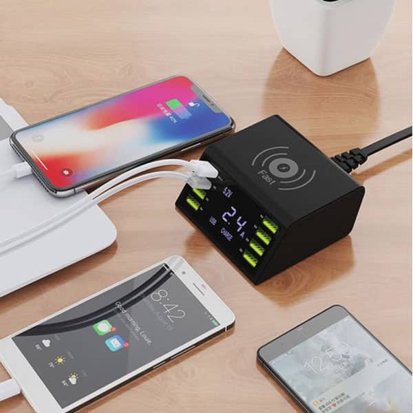 USB töltőállomás 8 port USB, vezetéknélküli töltéssel intelligens LED-kijelzővel